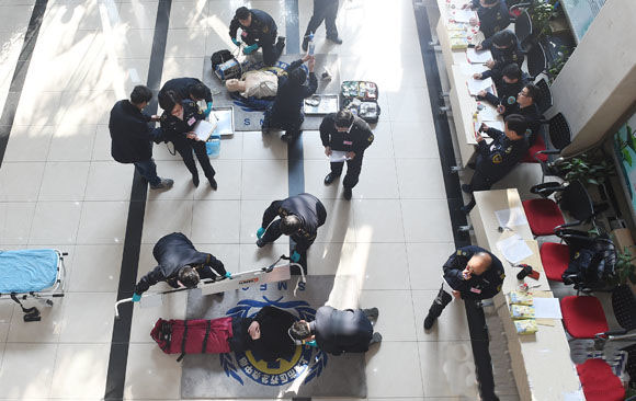 (救援人員正對傷員心肺復蘇模擬人進行心肺復蘇等應急處置)
