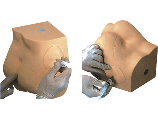 該模型設計簡單明了,半邊臀部區(qū)域內有注射部件區(qū)分虛線標志、注射模塊組成。注射模塊可以注射液體、方便取出、捏液體,是學員實習的理想產(chǎn)品。