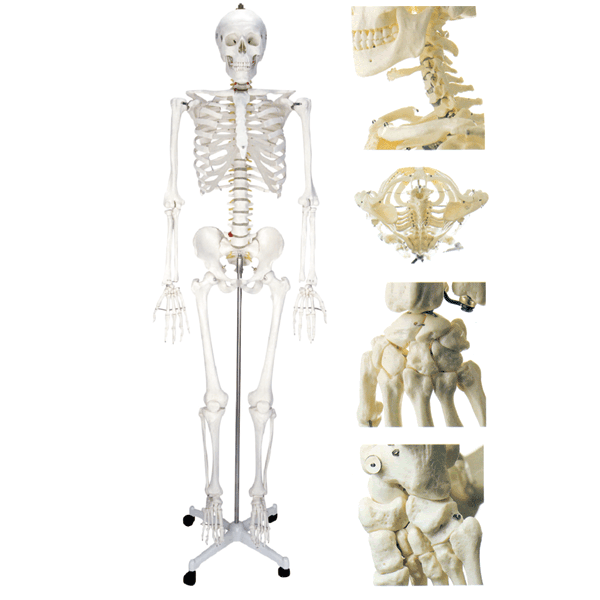 本模型示男性成人骨骼,串制成正常直立姿勢,四肢大的關(guān)節(jié)部分可活動.