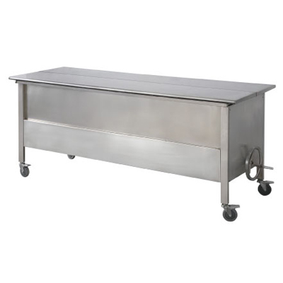 該解剖臺雙開臺面平移掛放,鋼繩升降,手搖減速傳動力,有標本儲藏及解剖等功能。帶萬向靜音剎車。