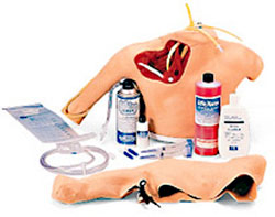 Now you can train residents and staff in the techniques of performing central venous catheterization using the NASCO Life/form® Total Parenteral Nutrition (TPN) Simulator. All appropriate landmarks are palpable for realistic identification of injection sites. Synthetic skin may be removed from shoulder to reveal dissected musculature and location of veins, arteries, and other landmarks. With the skin in place, you can actually insert the needle introducer. The tactile sensation is dramatically realistic. Artificial blood is connected to provide confirmation of proper needle location when "blood" flows from needle, just like the real thing! Venous catheters can be snaked into place once the introducer is properly inserted. Skin and veins will stand up to repeated puncture to allow training by dozens of staff members. The Life/form® skin and veins are easily replaced once worn. Also practice proper care of the puncture site and parenteral administrations. Practice measuring central venous pressure. Bandaging techniques can be practiced with no fear of infection or other harm to a patient. In emergency medical training programs, practice delivery of large volumes of fluids in trauma. Inject for swift action as required for cardiac life support procedures. Life/form® Heart Catheterization Simulator includes replaceable skin, tubing sealant, needles, 1 quart of Life/form® Blood, and teaching guide in a hard storage case. One-year warranty.